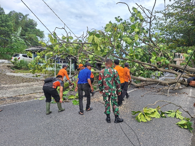 Peristiwa terjadi sekitar pukul 15.35 WIB dan sempat menutup total akses jalan serta menimpa jaringan kabel internet warga setempat.